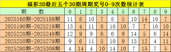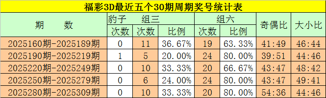在最近一个30期周期内(第2025280期-第2025309期),豹子奖号没有出现,组三奖号开出了10次,所占比例为40%,组六奖号共出现20期,开出比例为80%,上期出现组六号码之后,本期看好组六号码继续开出。